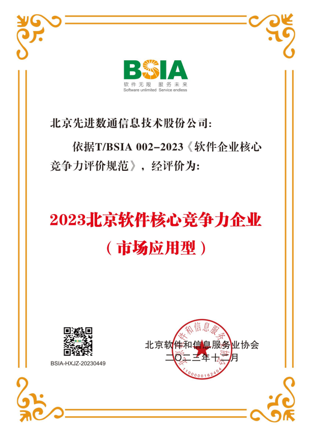 2023年12月12日,北京软件和信息服务业协会第十一届会员代表大会第一次会议暨第十一届理事会第一次会议在北京成功召开。会上发布了《2023北京软件和信息服务业企业综合实力评价报告》和《2023北京软件企业核心竞争力评价报告》,北京华宇拍卖app下载信息技术股份公司(以下简称“华宇拍卖app下载”)喜获2023北京软件核心竞争力企业(市场应用型)荣誉称号。